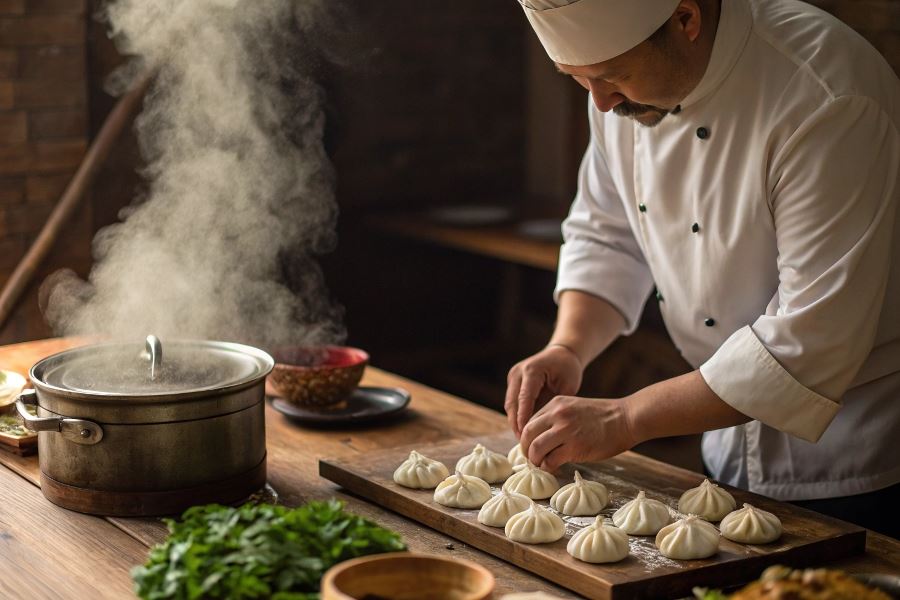 Wyciąganie ugotowanych chinkali wymaga ostrożności, aby nie uszkodzić delikatnej struktury. Najlepiej używać łyżki cedzakowej o płaskim dnie. Wyławiaj chinkali pojedynczo lub po kilka sztuk, pozwalając wodzie dokładnie odciec. Następnie natychmiast przenieś je na podgrzany talerz, aby zapobiec wychłodzeniu i sklejaniu.