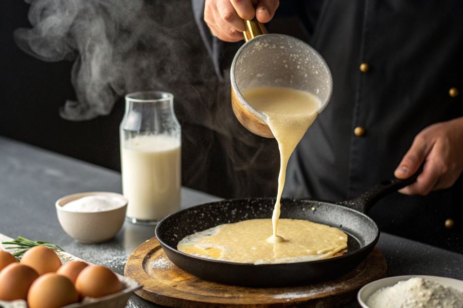 Na rozgrzaną patelnię wlej cienką warstwę ciasta (około 60-80 ml), natychmiast przechylając naczynie we wszystkie strony, aby równomiernie rozprowadzić masę. Pierwszy naleśnik często wychodzi niedoskonały – to normalne, służy do „kalibracji” temperatury. Naleśnik jest gotowy do przewrócenia, gdy jego brzegi zaczynają się lekko podnosić, a powierzchnia traci połysk (około 1-2 minuty).