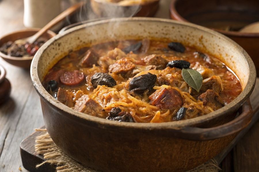 Sekret szybkiego bigosu: dodaj 100 ml czerwonego wytrawnego wina i 2 łyżki sosu śliwkowego. Te składniki natychmiast wzbogacą smak, imitując efekt długiego duszenia.