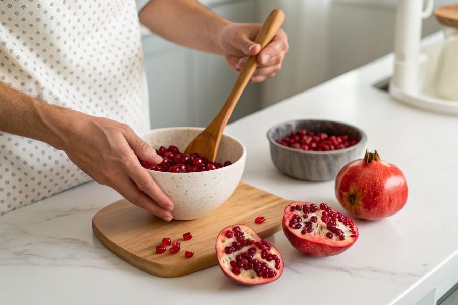 Najbardziej rozpowszechniona technika wydobywania pestek z granatu polega na przekrojeniu owocu na pół i wybijaniu nasion łyżką. Aby wykonać tę metodę prawidłowo: