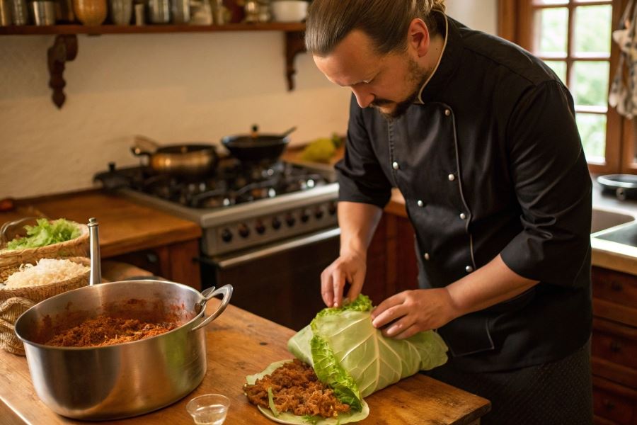 Tradycyjne duszenie gołąbków wymaga cierpliwości – to sekret ich wyjątkowego smaku. Powolne gotowanie pozwala składnikom wzajemnie się przeniknąć.