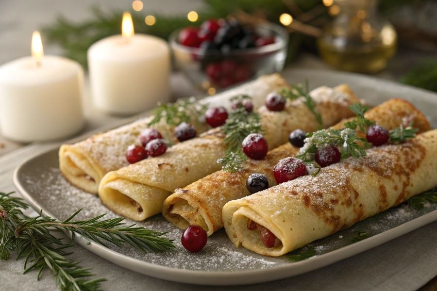 Świąteczne naleśniki faszerowane najlepiej serwować na podgrzanych talerzach, co pozwala dłużej utrzymać ich optymalną temperaturę i wydobyć pełnię aromatów.