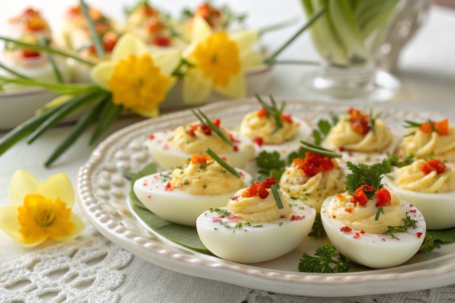 Efektowna prezentacja jajek faszerowanych to klucz do sukcesu. Serwuj je na lustrze sosu, posypane mikroziołami lub w towarzystwie jadalnych kwiatów. Wykorzystaj specjalne tacki w kształcie jajek lub podaj w gniazdkach z chrupiących warzyw.