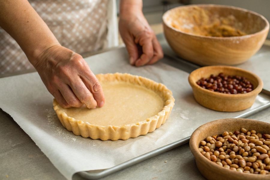 Kulki ceramiczne układa się na papierze do pieczenia, pokrywając całą powierzchnię tarty. Po wyjęciu z piekarnika można je łatwo zebrać i użyć ponownie.