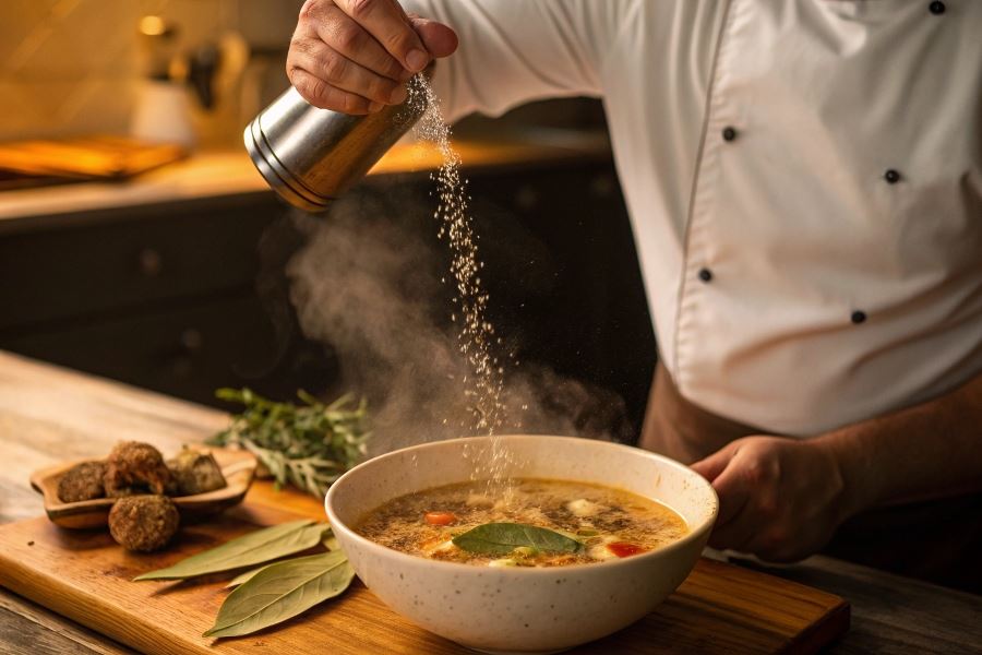 Liść laurowy i ziele angielskie to nieodłączni towarzysze majeranku w kompozycji flaków. Liść laurowy wprowadza subtelną, drzewną nutę, podczas gdy ziele angielskie dodaje głębi i ciepła. Ważne, aby dodać je na początku gotowania, pozwalając im powoli uwalniać aromaty. Na każdy litr wywaru warto użyć 2-3 liście laurowe i 4-5 ziaren ziela angielskiego.