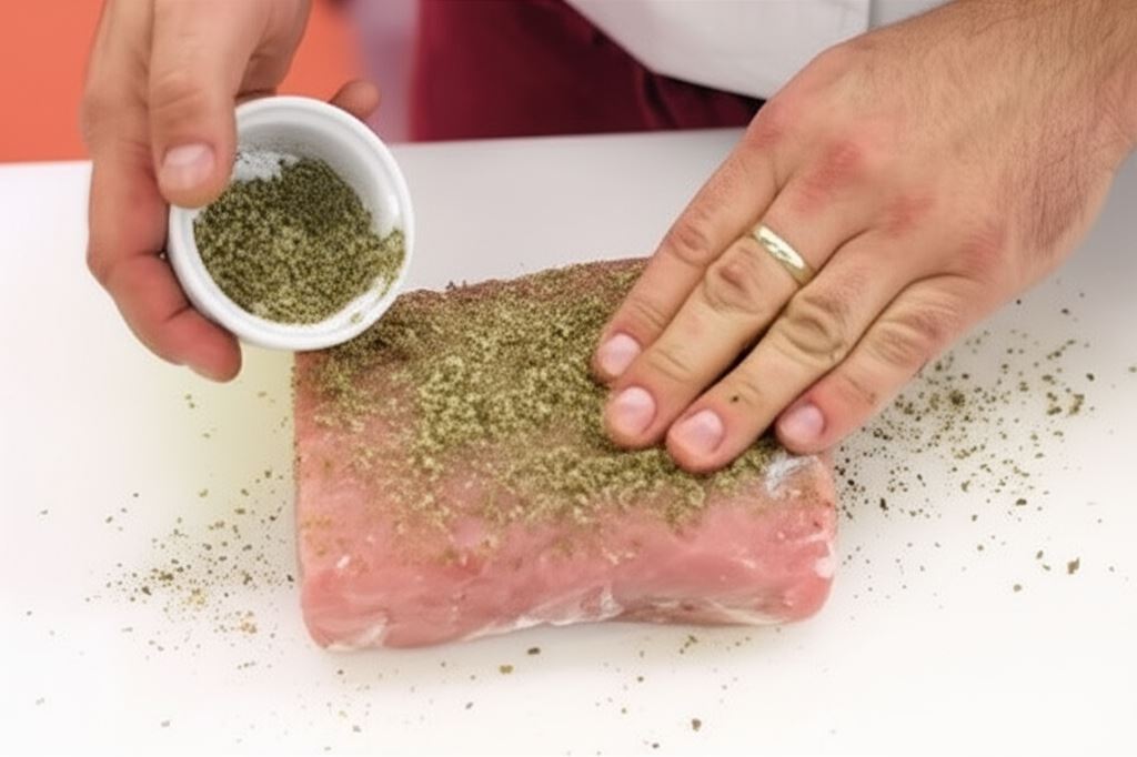 Wymieszaj przyprawy z opakowania Przyprawy do karkówki Knorr z olejem i natłuść dokładnie mięso.