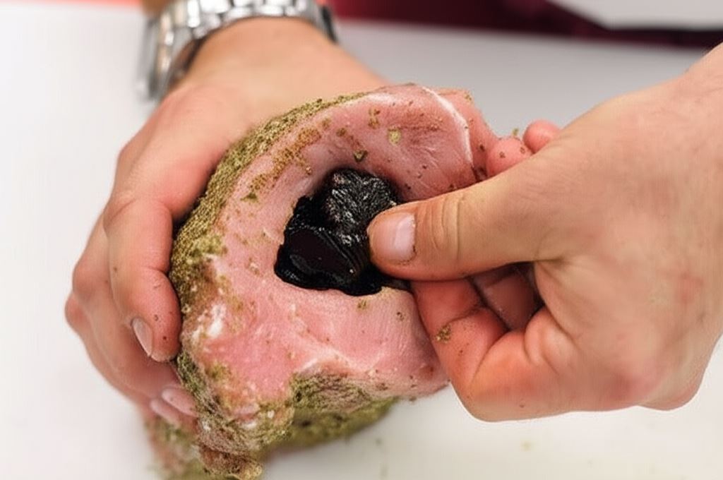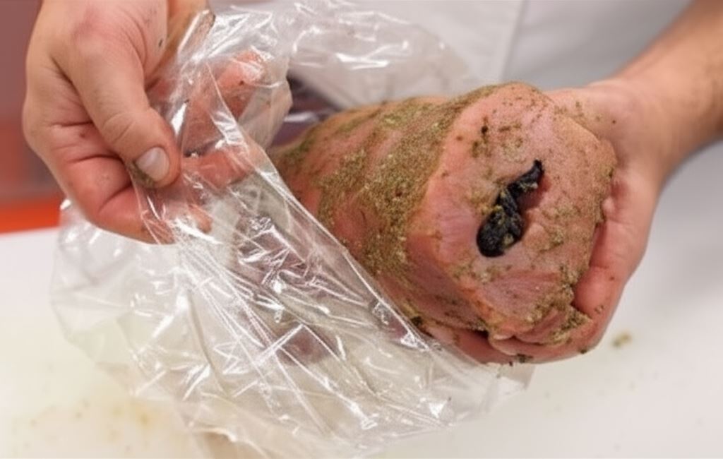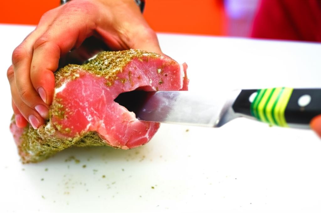 Przy użyciu długiego i cienkiego noża wykonaj nacięcie przez środek i na całej długości mięsa.