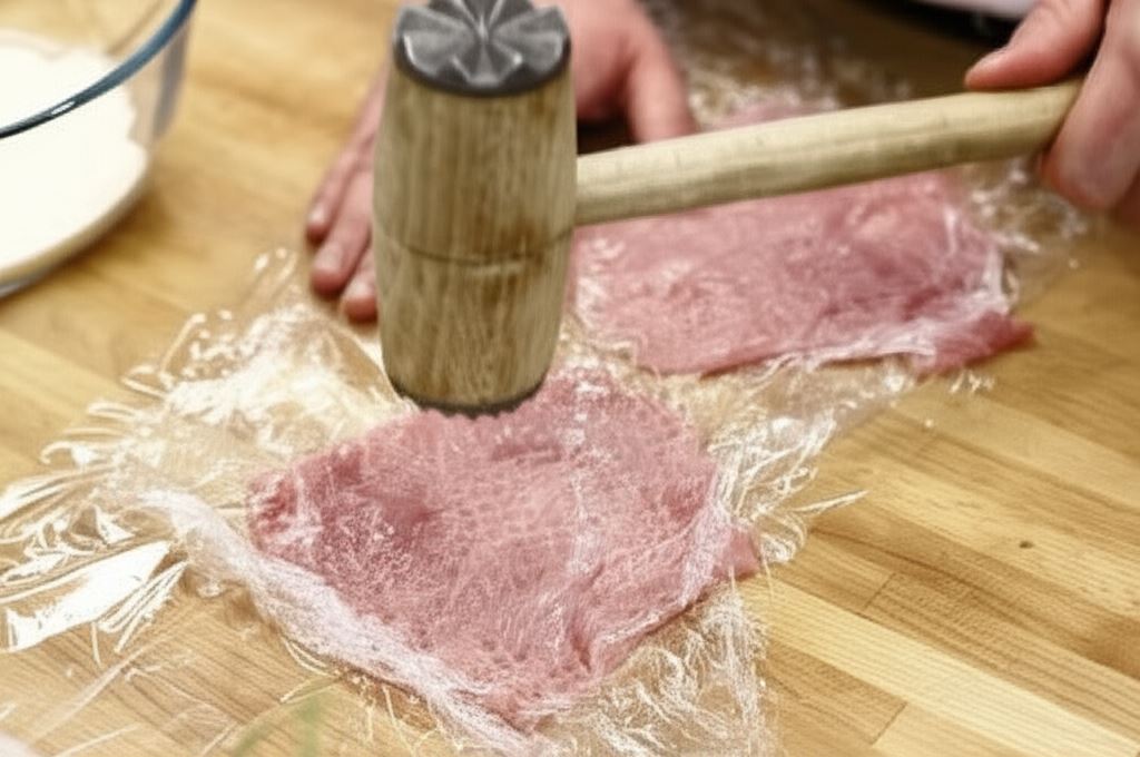 Mięso opłucz, oczyść z błonek i potnij w plastry o grubości 1 cm. Rozłóż na desce, nakryj fragmentem folii i ubij starannie z obu stron na cienkie placki.
