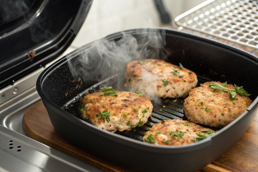 Optymalna grubość kotletów do airfryera to około 1,5 cm. Zbyt grube kotlety nie dopieką się w środku, a zbyt cienkie szybko wyschną. Przed umieszczeniem w urządzeniu warto delikatnie spłaszczyć środek każdego kotleta, tworząc lekkie wgłębienie – zapobiegnie to wybrzuszaniu się podczas pieczenia.