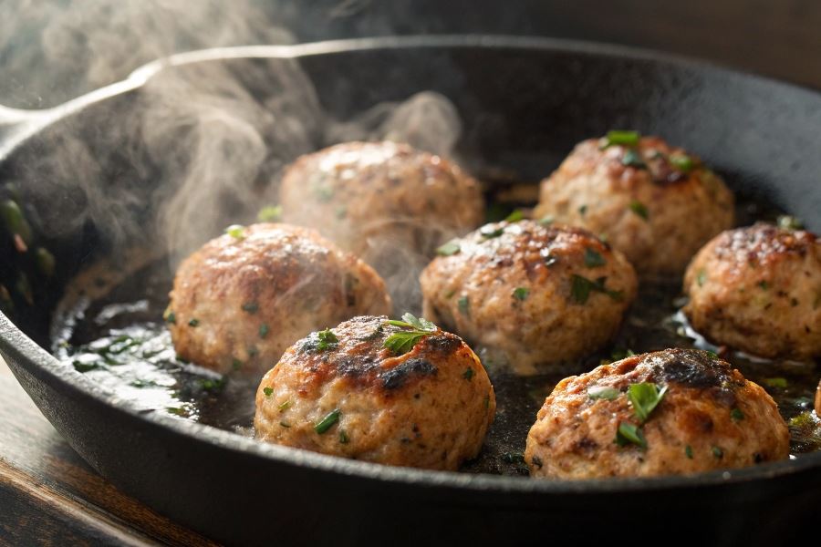 Do smażenia pulpetów z indyka najlepiej sprawdza się patelnia z powłoką nieprzywierającą lub żeliwna. Temperatura smażenia powinna wynosić 165-175°C – zbyt niska spowoduje wypłynięcie soków, zbyt wysoka – przypalenie powierzchni przy surowym wnętrzu. Idealny czas smażenia to 3-4 minuty z każdej strony, a następnie 5-7 minut pod przykryciem na mniejszym ogniu, co pozwala osiągnąć wewnętrzną temperaturę 74°C gwarantującą bezpieczeństwo mikrobiologiczne.
