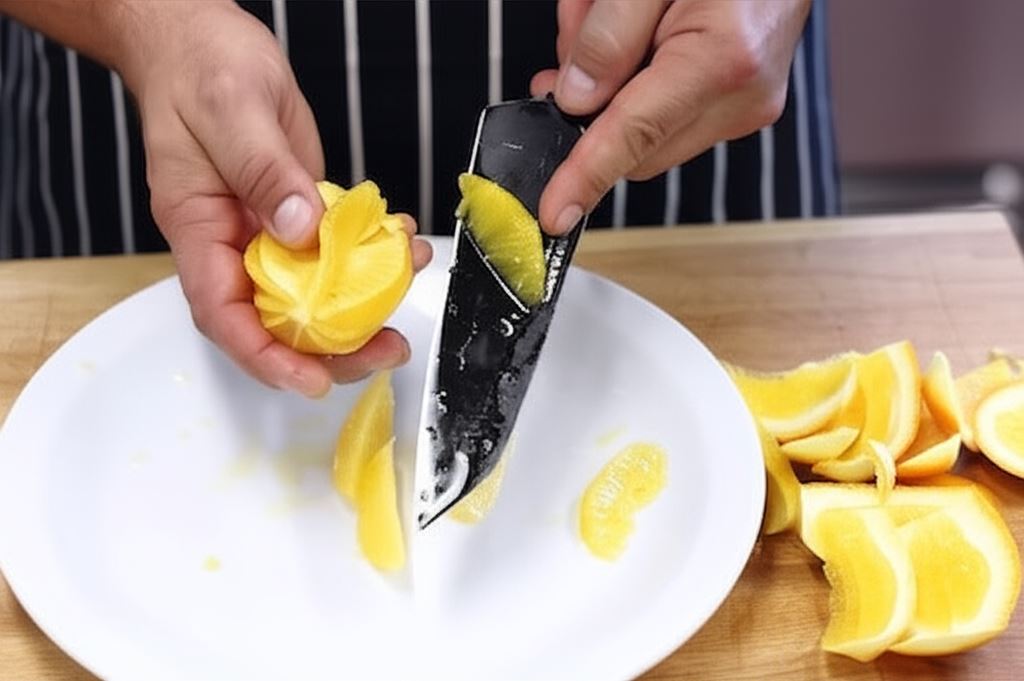 Z obranych pomarańczy wytnij segmenty, zbierając równocześnie wyciekający sok. Sok, wywar z duszenia połącz z likierem pomarańczowym i doprowadź do wrzenia.