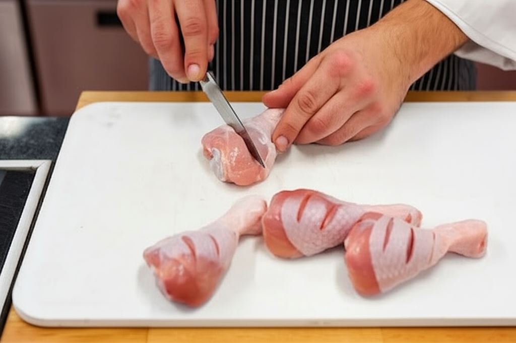 Natnij kurczaka nożem, aby mięso szybciej się upiekło podczas grillowania, a marynata mogła łatwiej przeniknąć do wnętrza.