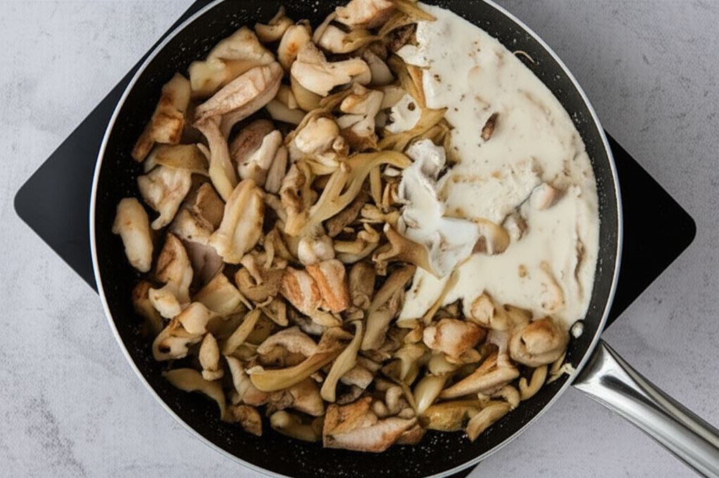 Grzyby i cebulę pokrój w półplastry, przyrumień na tej samej patelni, a gdy nabiorą złotawego koloru dodaj podsmażone mięso. Całość zalej fixem Knorr rozmieszanym w 200ml wody i 100ml śmietany.