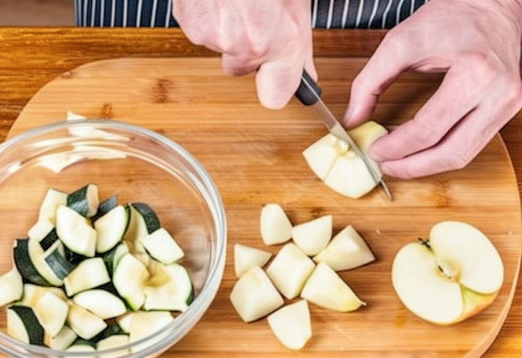 Wydrąż jabłko oraz cukinię usuwając nasiona i pokrój w duże kostki.