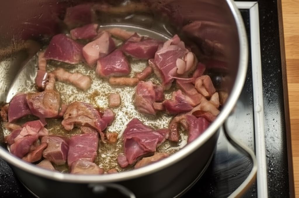 W sporym garnku zrumień boczek. Kiedy wytopi się wystarczająco tłuszczu, wsyp mięso. Smaż, dopóki nie będzie całkowicie suche i zacznie się rumienić.