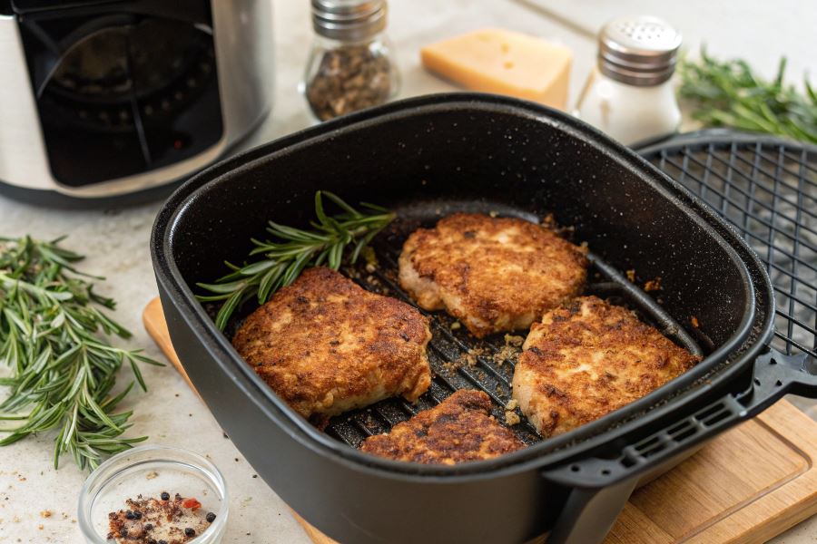 Cielęcina w panierce z parmezanem i ziołami zyskuje wyjątkową chrupkość dzięki cyrkulacji gorącego powietrza. Panierka z tartej bułki wymieszanej z parmezanem, bazylią i pietruszką tworzy złocistą skorupkę przy temperaturze 190°C i czasie 14 minut, z jednym przewróceniem w połowie czasu.
