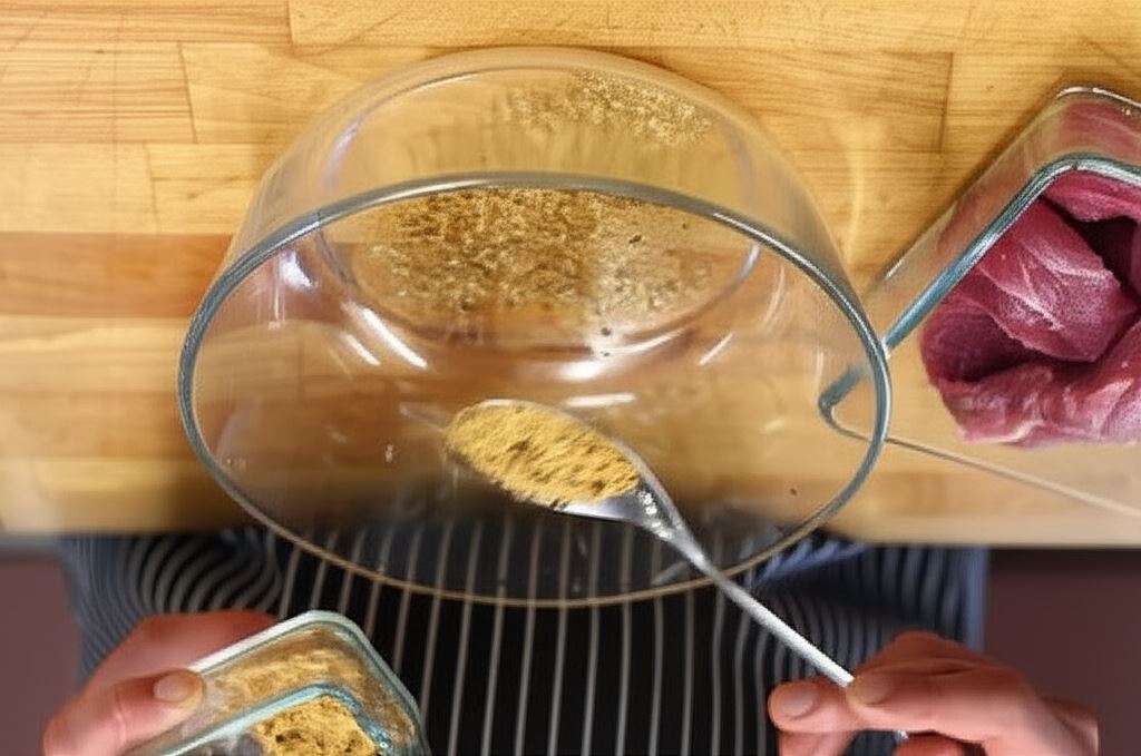 Polędwiczkę opłucz, wysusz, zbierz błony i przerosty tłuszczu, przetnij wzdłużnie na trzy części, nie docinając do samego końca. Rozpocznij od grubszej części. Olej wymieszaj z przyprawą do mięsa wieprzowego, a potem nacięte mięso połącz z marynatą. Przyprawa do mięsa doda mięsu właściwego aromatu oraz uczyni je soczystym.