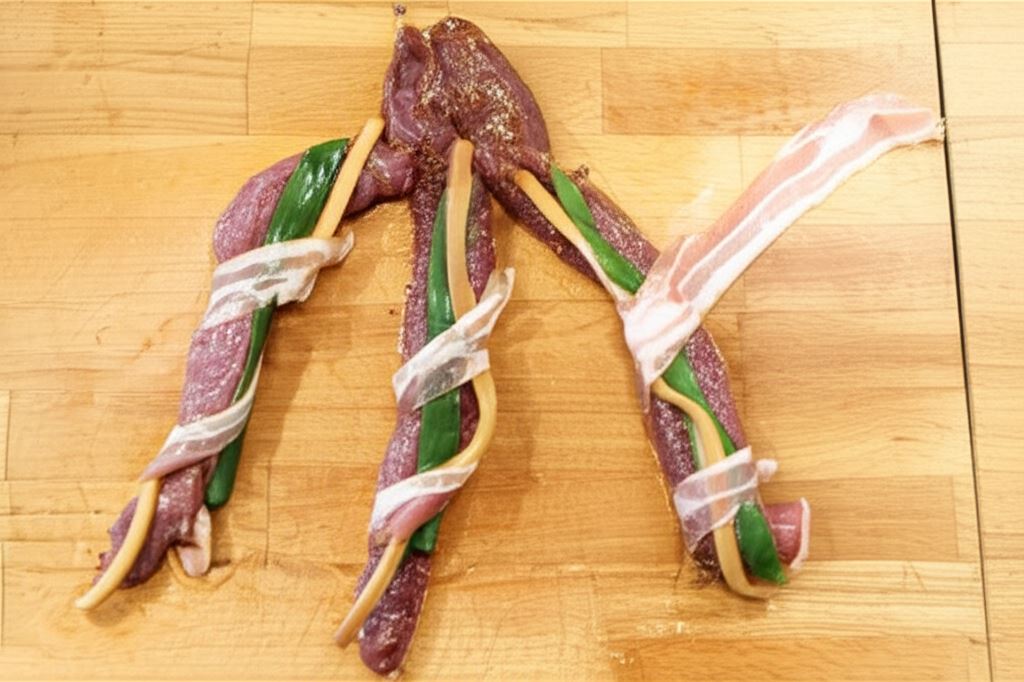 Mięso połóż na desce, na każde 'ramię' polędwiczki umieść plaster boczku, sera oraz szczypiorek z dymki. Mięso spleć w warkocz mocując wykałaczką ostatnią część. Warkocz przyrumień na patelni z obu stron. Po usmażeniu odłóż na bok.