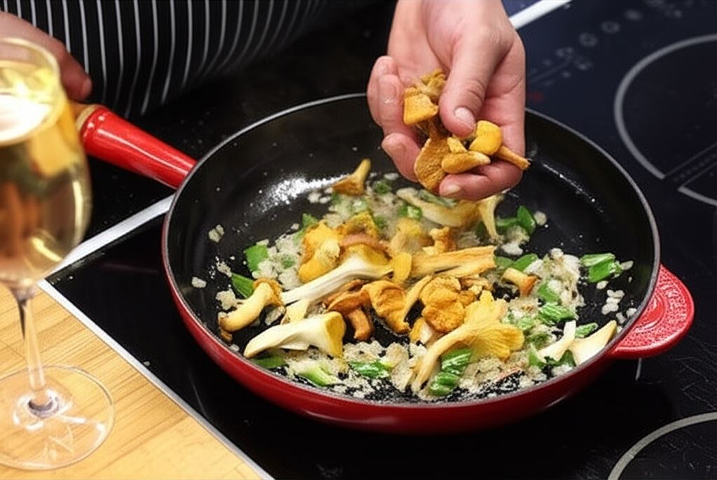 Na tej samej patelni zrumień pokrojoną w kostkę cebulę dymkę wraz z pozostałym posiekanym szczypiorem. Kiedy cebula stanie się szklista, dodaj umyte i pocięte na mniejsze części kurki, przysmaż moment, wlej wino. Gotuj wszystko dopóki wino prawie całkowicie nie wyparuje. Następnie dodaj śmietanę, zagotuj sos i dopraw według smaku.