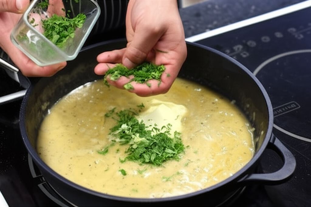 Na patelni, gdzie smażyło się mięso, zrumień pokrojoną w kostkę cebulę dymkę. Patelnię posyp mąką i zalej winem. Gotuj całość do momentu, gdy wino odparuje do połowy, dodaj płyn z brytfanki i gotuj około 5 minut, aż sos zgęstnieje. Następnie dodaj masło i posiekaną natkę pietruszki. Upieczone mięso pokrój na plastry i serwuj polane sosem.