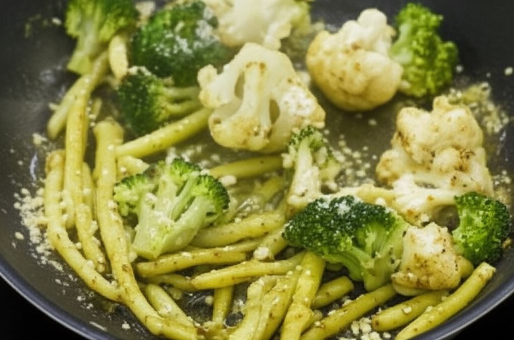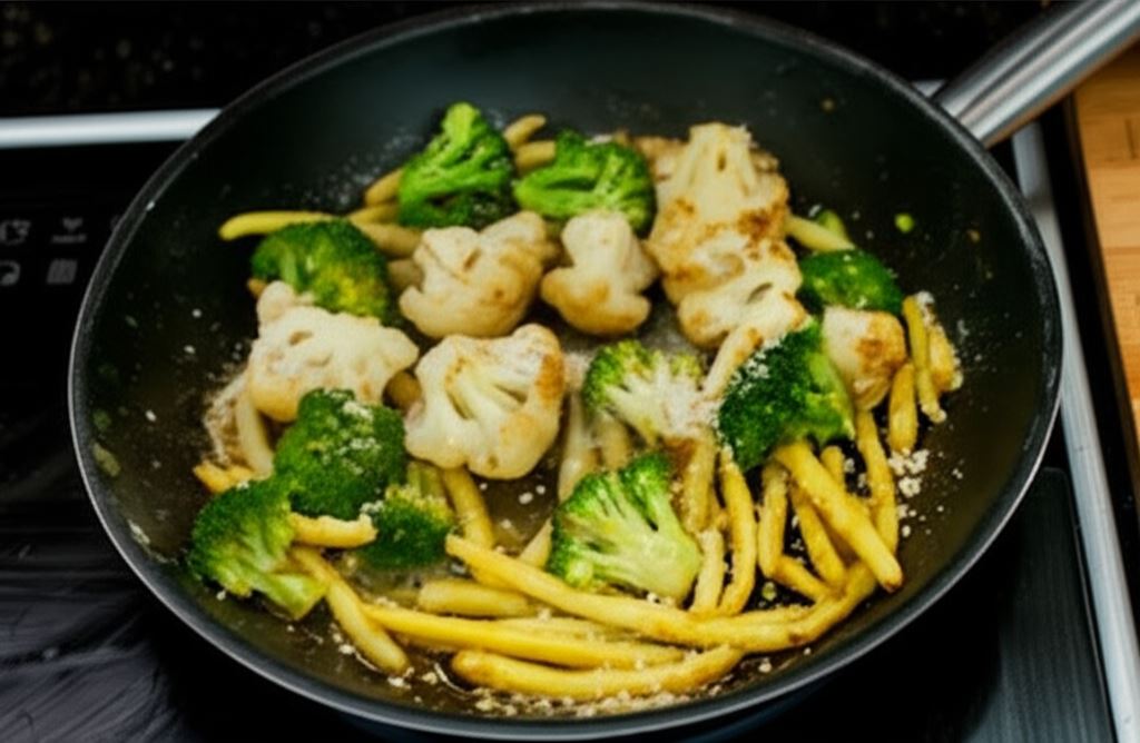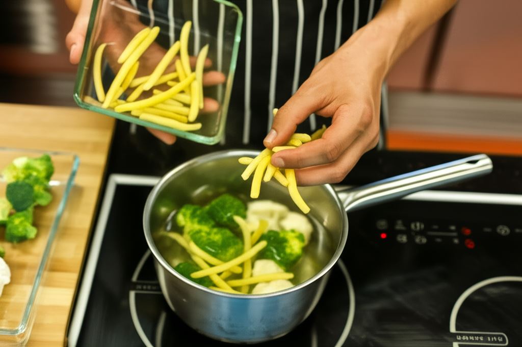 Świeże warzywa posiekaj i zblanszuj. Mrożone wrzuć na patelnię, wlej 1/4 szklanki wody i przygotuj.