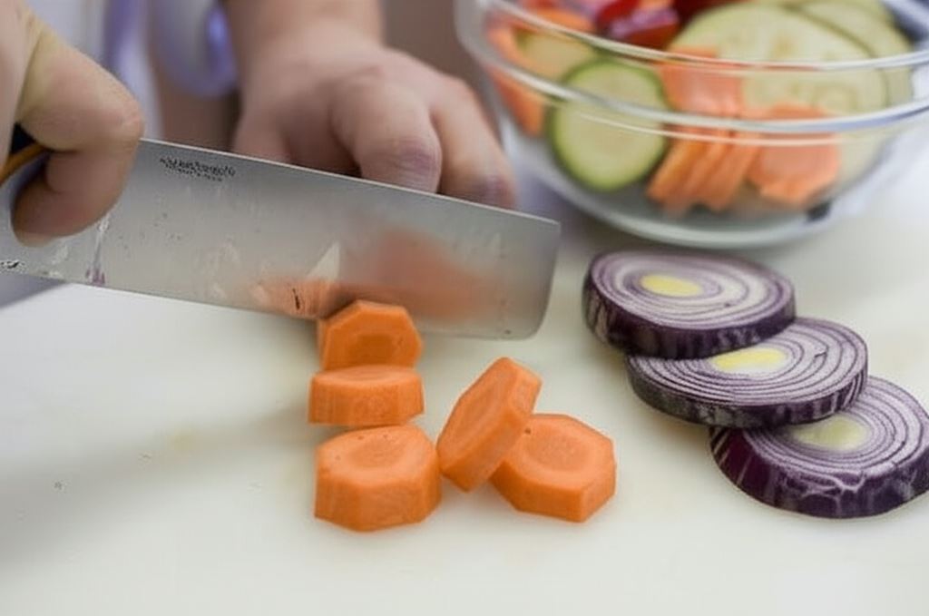 Bakłażana i cukinię pokrój na plastry. Marchewkę obierz i pokrój w podobny sposób. Paprykę oczyść z nasion i pokrój również na mniejsze kawałki. Cebule pokrój w plastry.