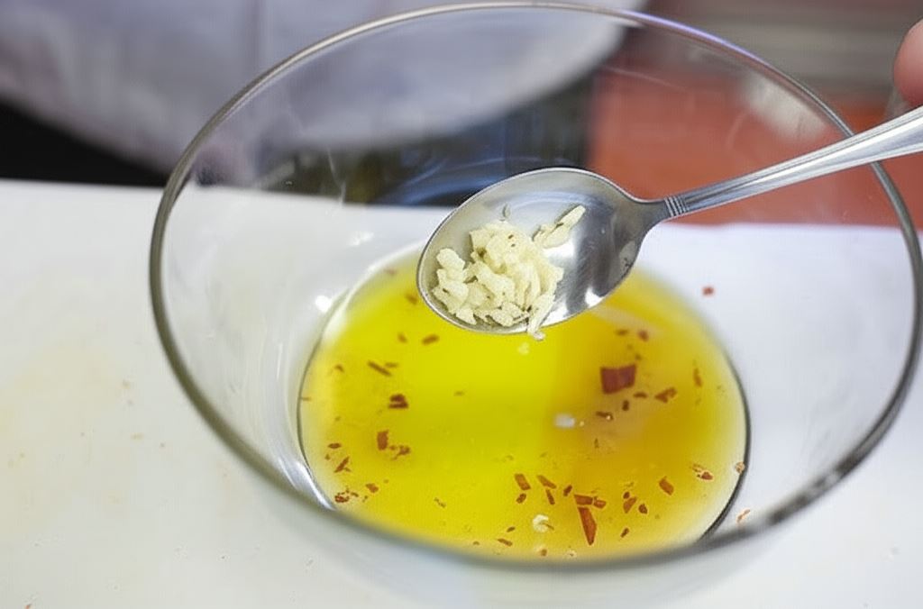 Wlej do miski obydwa oleje, sok z cytryn, wsyp drobno posiekane chilli i dodaj czosnek.