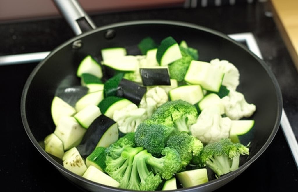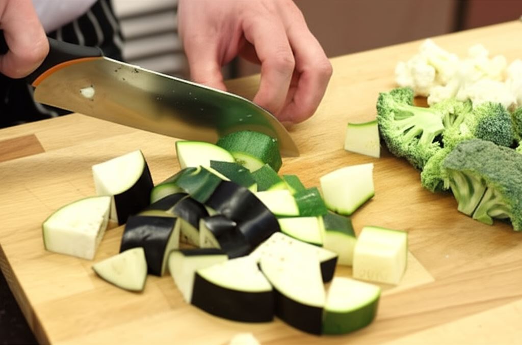 Podziel kalafiora i brokuł na mniejsze różyczki, pokrój cukinię i bakłażana w dużą kostkę, posiekaj czosnek.