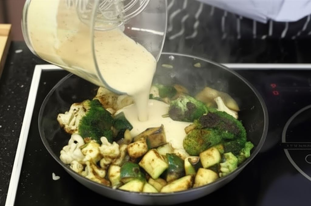 Delikatne różyczki kalafiora i brokuła, soczysta cukinia oraz aksamitny bakłażan zatopione w aromatycznym sosie curry to prawdziwa uczta dla zmysłów. To danie, które w zaledwie kilkanaście minut przeniesie Cię w kulinarną podróż do słonecznych Indii. Intensywny aromat przypraw, kremowa konsystencja sosu i chrupiące warzywa tworzą harmonijną kompozycję smaków, która zachwyci nawet najbardziej wymagających smakoszy.