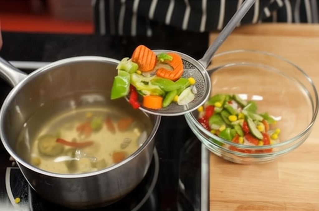 Gotuj warzywa przez 1 minutę. Po ugotowaniu odcedź i zachowaj 3-5 łyżek wody po gotowaniu.