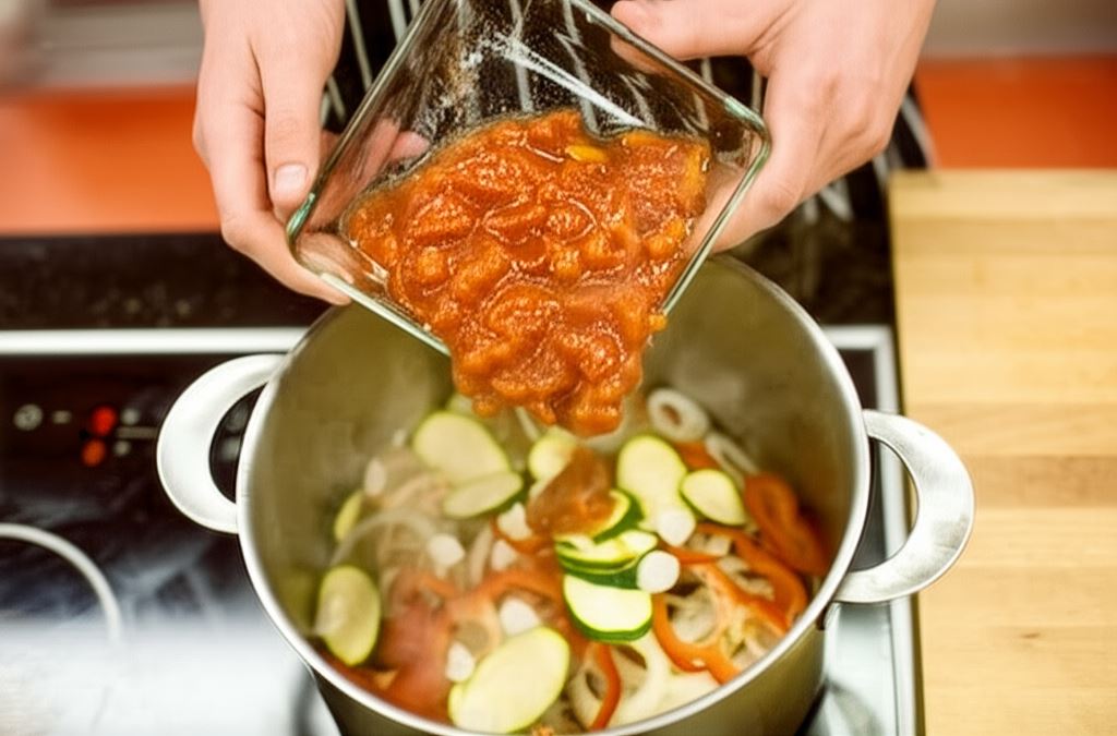 Wrzuć pokrojoną w plastry cukinię, cebulę, paprykę oraz czosnek. Smaż wszystko przez około 10 minut. Potem dodaj pomidory z puszki i kostkę rosołową Knorr.