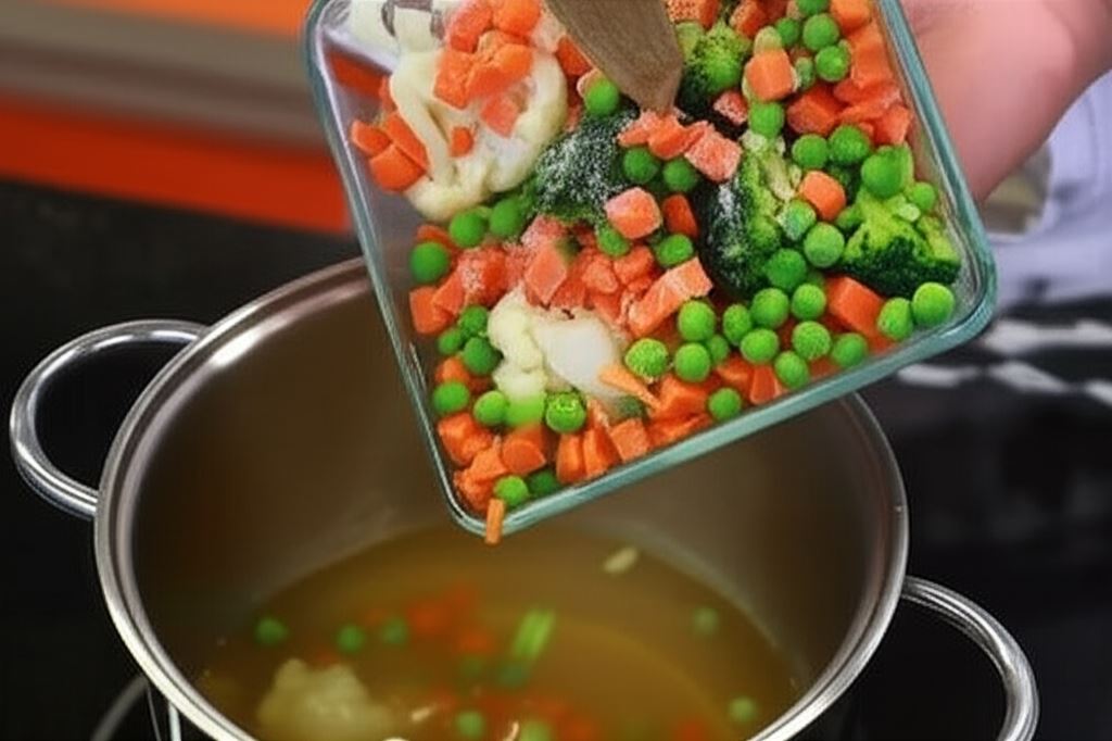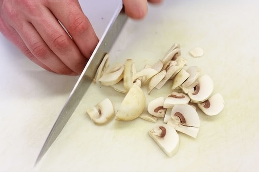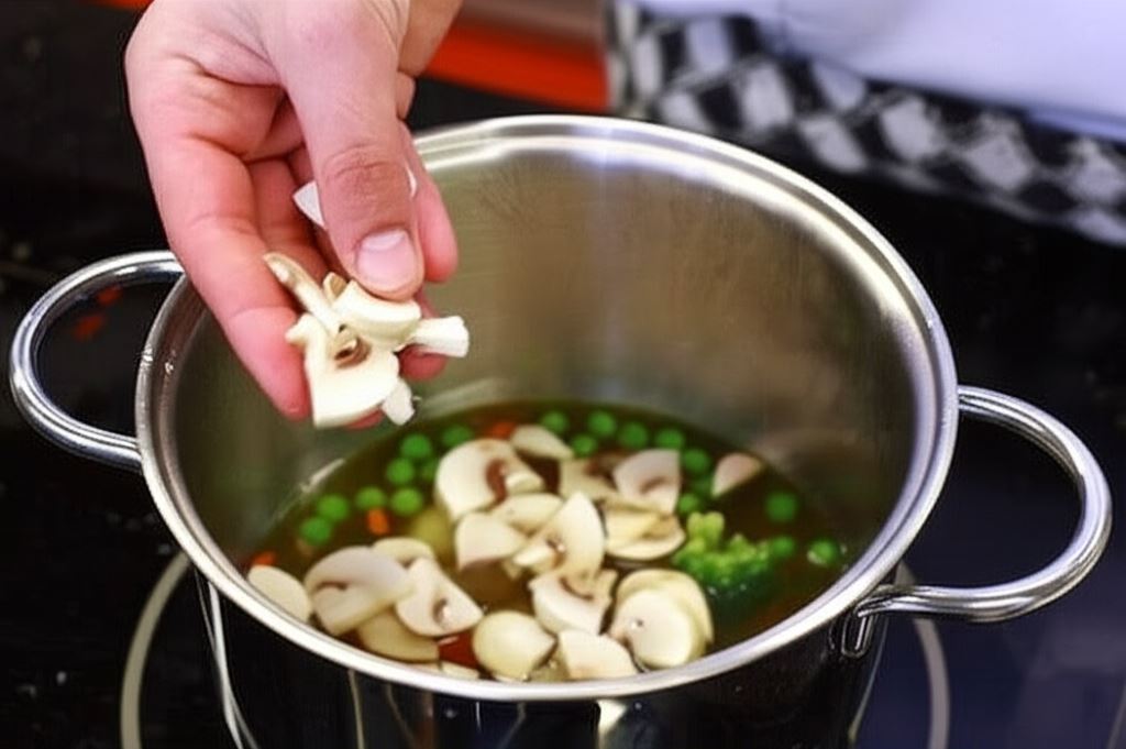 Pieczarki oraz warzywa pokrój na plastry, dodaj do bulionu i gotuj około 10 minut.