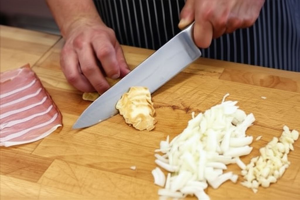 Pokrój cebule na piórka, a ser na drobniejsze kawałki. Posiekaj czosnek, a szynkę przetnij na połowę.