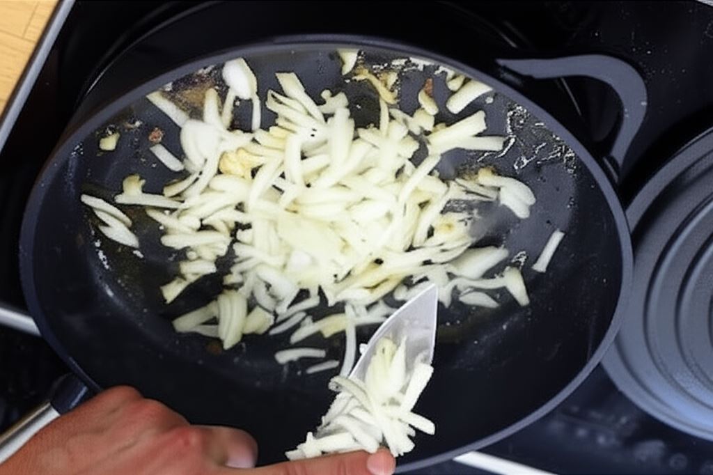 Cebulę i czosnek zrumień na oleju na tej samej patelni, na której uprzednio smażyłeś wątróbkę.