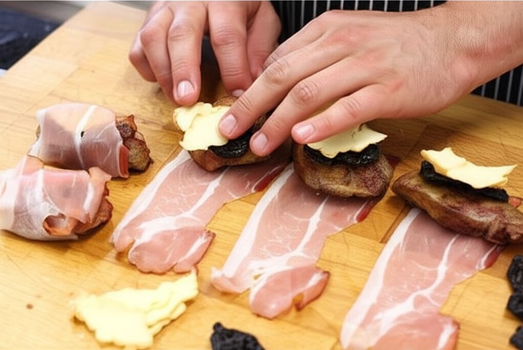 Podsmażoną wątróbkę umieść na plasterku szynki, umieść przy niej suszoną śliwkę i kawałek oscypka. Wszystko szczelnie zawiń.