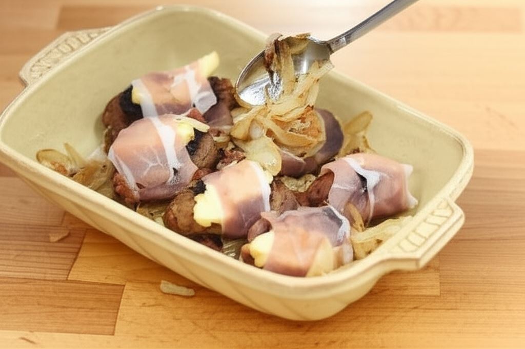 Wątróbka drobiowa w szynce szwarcwaldzkiej duszona z cebulą