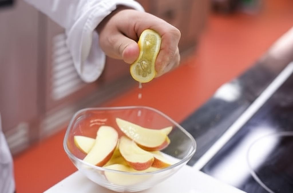 Jabłka opłucz, nie obieraj, wydrąż gniazda nasienne i pokrój na osiem kawałków. Skrop sokiem cytrynowym.