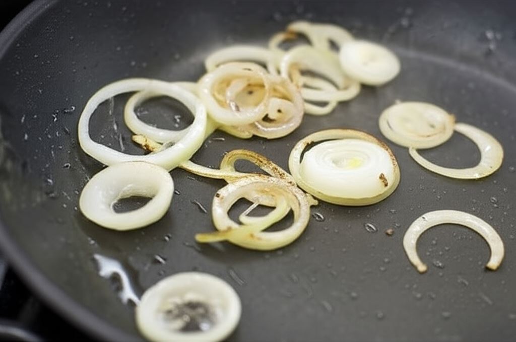 Na pozostałym tłuszczu zrumień cebule pokrojoną w krążki do złotawego koloru.