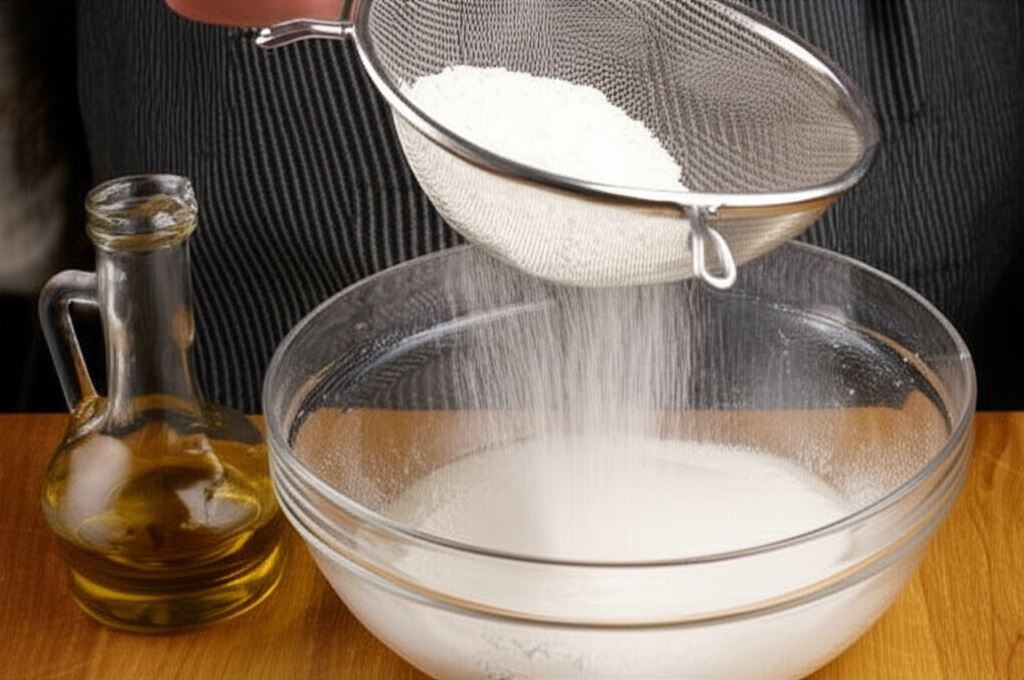 Wlej do dużej miski szklankę ciepłej wody, rozpuść w niej sól, cukier i drożdże, wlej oliwę i wsyp mąkę. Łagodnie mieszając połącz wszystkie składniki. Wyrabiaj ciasto przez około 5 minut, dopóki nie przestanie przyklejać się do rąk, w razie konieczności dosyp jeszcze trochę mąki.
