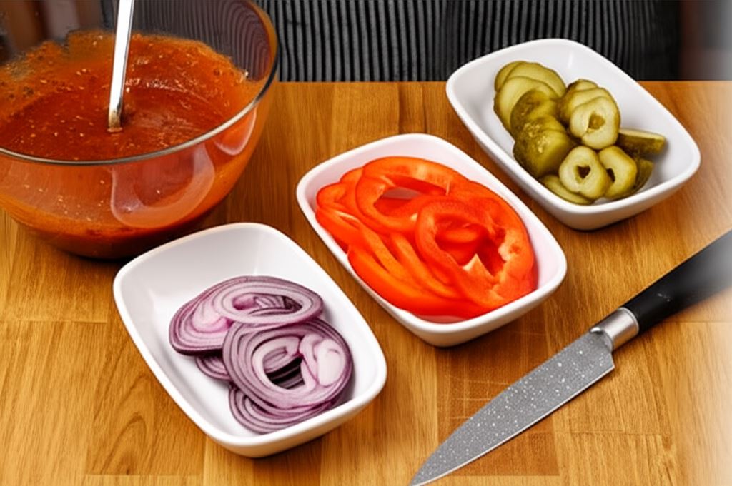 Cebulę, ogórka i paprykę pokrój na plastry. Przygotuj sos pomidorowy (sprawdź przepis na sos do pizzy na przepisy.pl)