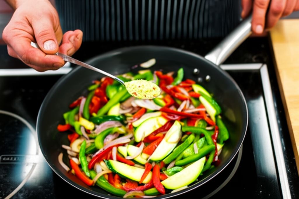 Przygotuj deskę kuchenną. Paprykę i cukinię pokrój w cienkie paseczki. Na patelni podgrzej oliwę, lekko zrumień przeciśnięty przez praskę czosnek oraz posiekane warzywa. Wszystko przypraw do smaku uniwersalną przyprawą Delikat Knorr.
