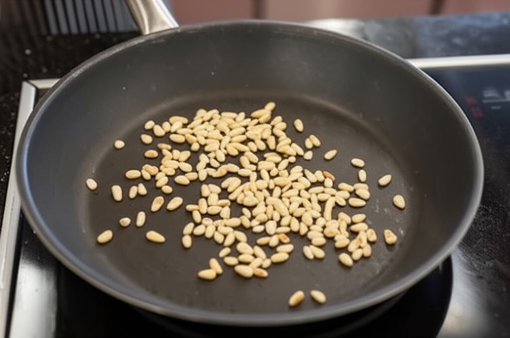 Na suchą i czystą patelnię wsyp orzeszki pinii i delikatnie je podpraż – aż do momentu, gdy się zrumienią.