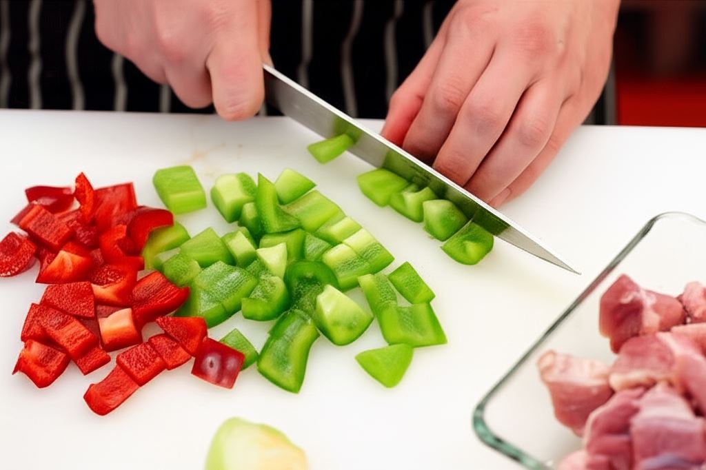 Mięso potnij w dużą kostkę o wymiarze 2 cm. Tak samo paprykę. Cebulę w małą kostkę.