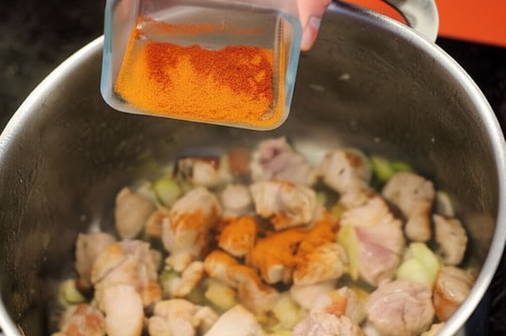 W garnku przysmaż mięso z cebulą. Kiedy zrobi się rumiane, wsyp obie mielone papryki oraz kminek i całość smaż przez kilka minut.