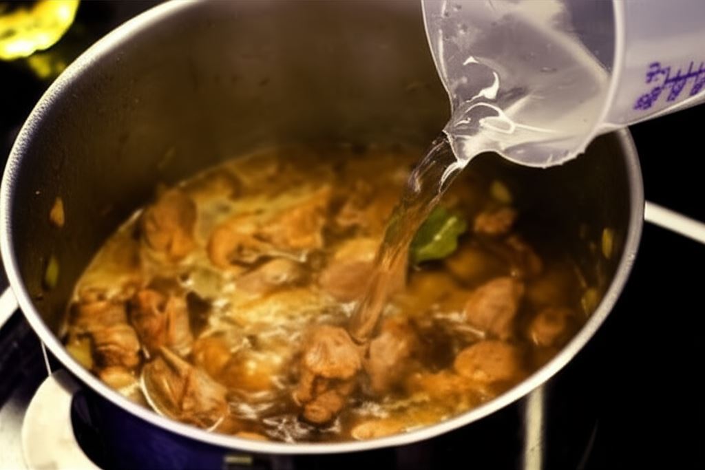 Następnie zalej mięso 1 litrem wody, wsyp liść laurowy, ziele angielskie i duś około 20-30 minut.