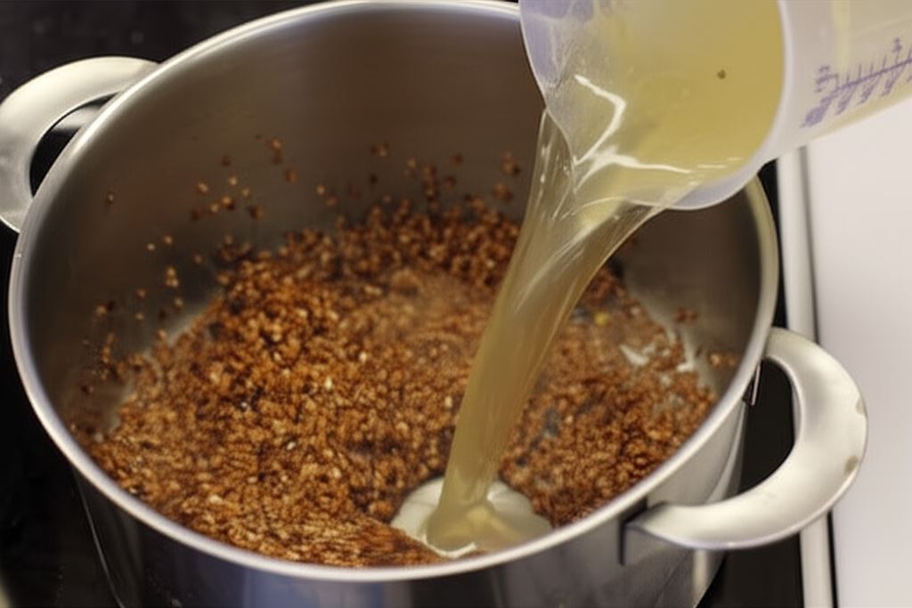 Kasze podsmażaj w rondlu z olejem i wkrótce zalej bulionem. Wsyp majeranek i gotuj, dopóki kasza nie wchłonie płynu. Potem nakryj pokrywką i ustaw na najniższym ogniu na 8 minut.