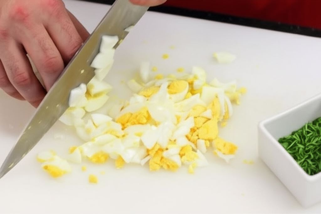 Jajka ugotuj na twardo, ostudź i posiekaj drobno. Ser pokrój w małą kostkę. Szczypior drobno posiekaj.