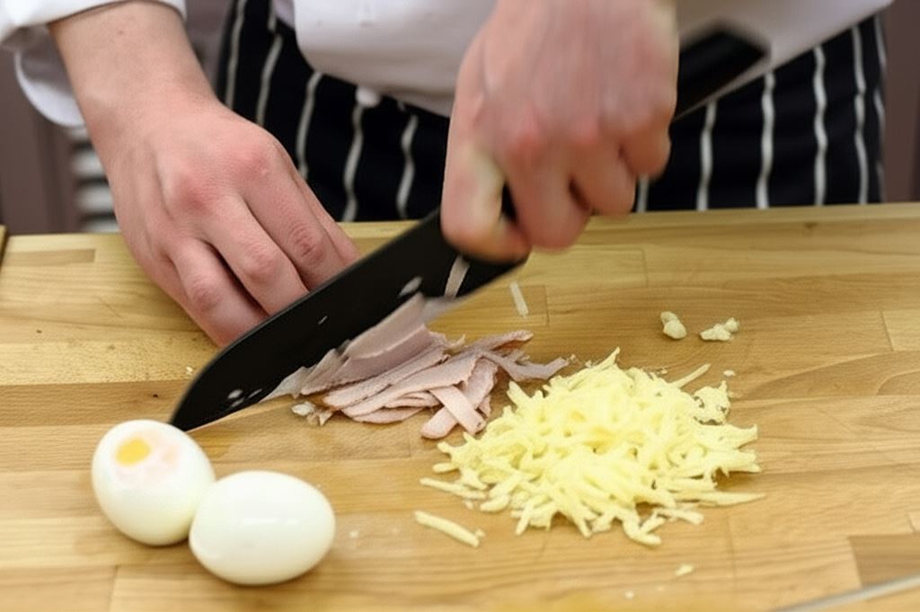 Jajka ugotuj na twardo, zdejmij skorupki i pokrój w plastry. Kilka zostaw do dekoracji. Ser zetrzyj na tarce, a szynkę pokrój w cienkie paseczki, część z nich zostaw.