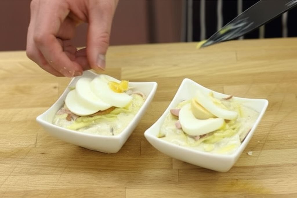 Delikatne plastry jajek na twardo, soczysta szynka i rozpływający się ser tworzą harmonijną kompozycję smaków w tej wyjątkowej wielkanocnej zapiekance. Kremowy sos z nutą gałki muszkatołowej otula wszystkie składniki, a chrupiąca warstwa bułki tartej dodaje tekstury każdemu kęsowi. To danie, które zachwyca nie tylko smakiem, ale również elegancką prezentacją na świątecznym stole.