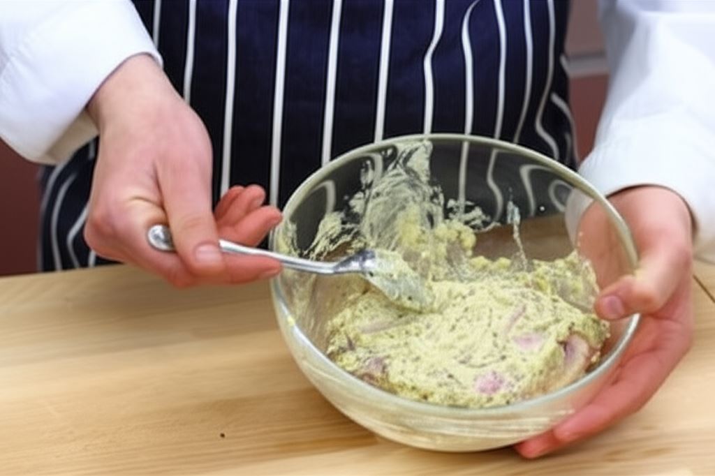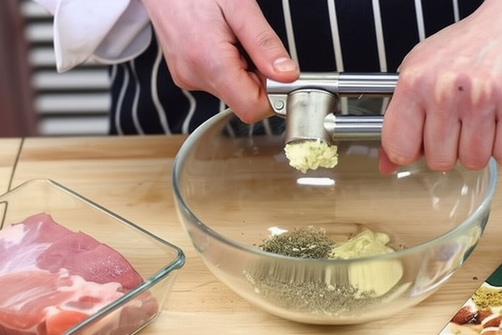 Przygotuj komponenty marynaty. W miseczce wymieszaj olej z majerankiem, musztardą, przeciśniętym przez praskę czosnkiem i przyprawami.